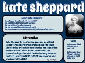 On thursday and friday we have been learing about kate sheppard we made some posters about kate sheppard we got to pick a friend to do it with and my friend was Gracie so me and gracie did 2 posters about kate sheppard.